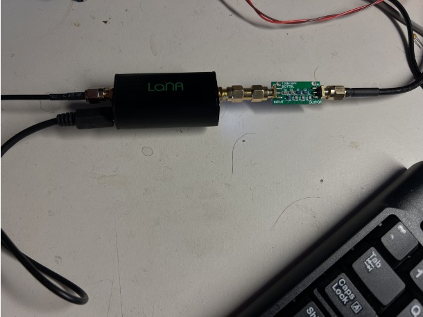 If we wanted to improve our signal-to-noise we should amplify and target our signal more. To do this, I have a couple Low-Noise-Amplifiers and a few FM-band-pass filters in lab. Connect the antenna to the input of the LNA, the output of the LNA to the input of the filter, and then the output of the filter to ADC_B. Make sure the LNA is powered...