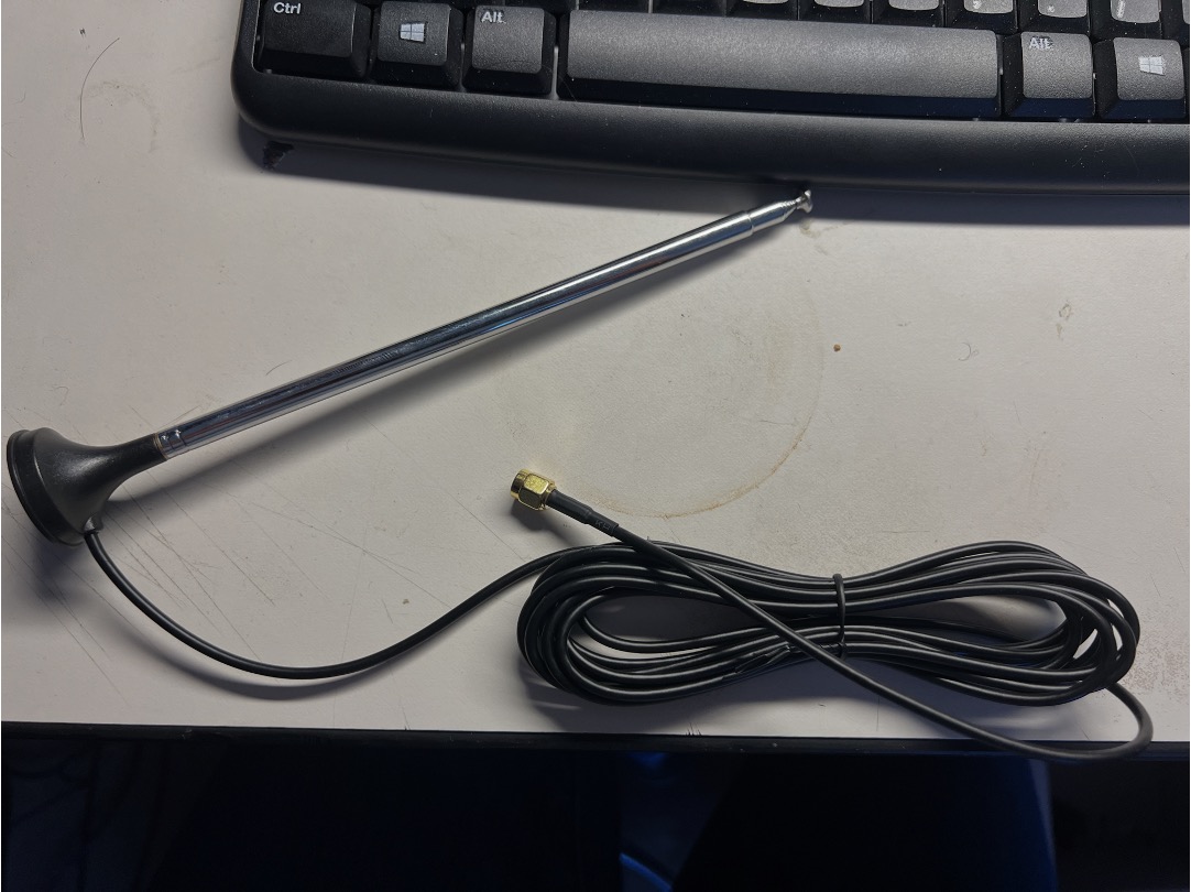 Now that we know stuff is hopefully coming through, is there anything legitimate we could measure? Why yes, let's jam an antenna on and see if we can capture a signal out of the ether. Around lab there should be some FM antennas that look like this:
