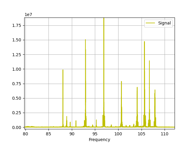 Zooming in on one of the large spikes you can actually see a complete FM commercial station in the frequency space. The big spikes going left to right are: