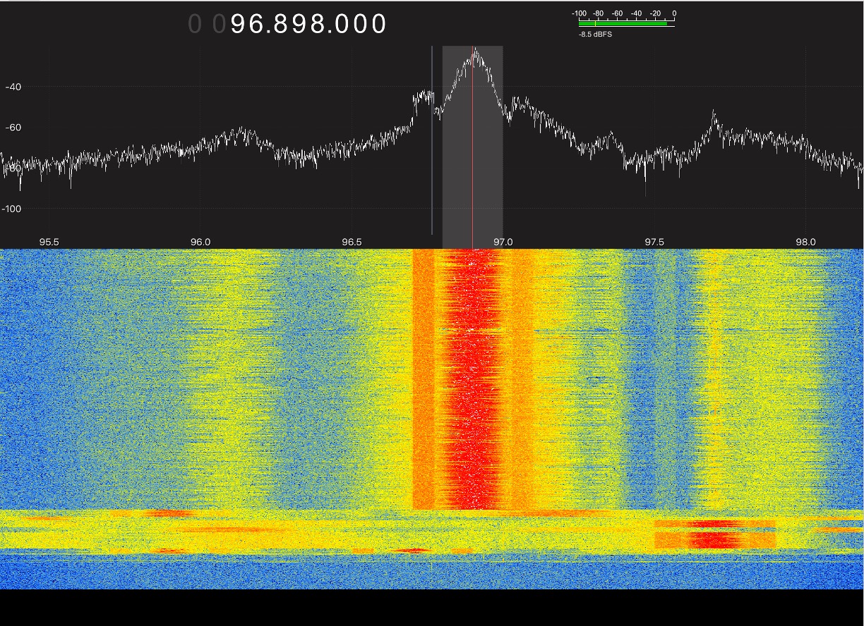 Since not everyone in the year 2025 knows what an FM station looks like in frequency space, here is a screengrab of one off of one of my Software Defined Radios.