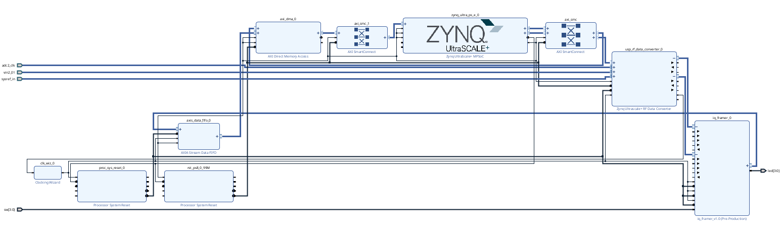 OK, the RF Data converter will work as it is, but without any context/packaging, it is tough to get it into the PS side. As a result, there's a few things we want to do to "package" the data stream coming out of it. We'll wrap all of that functionality up into a single piece of IP which I'll call "iq_framer", but you can call it whatever you want. This piece of IP will live between the RF data converter and the DMA. All of its ports are shown fully-expanded out: